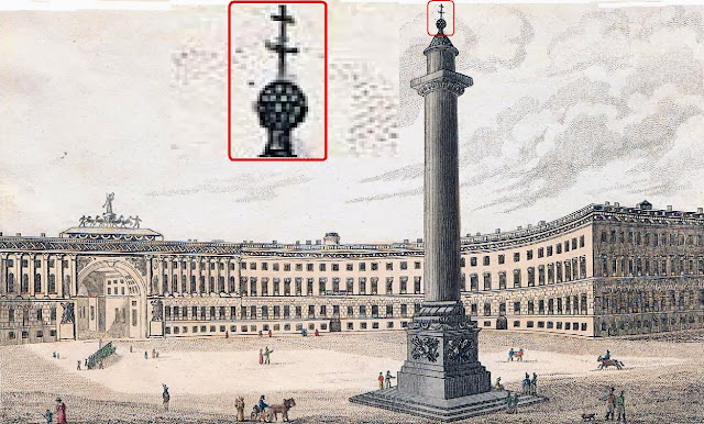 Поэтому, все упирается в датировку гравюры. Откуда продавец взял, что она 1820 года - науке не известно. Может быть это его ошибка или опечатка. В пользу альтернативной версии кроме этой даты говорит и то, что на колонне не крест, а что-то лишь похожее на него. А если лишь похожее, то вряд ли это фантазия художника о проекте колонны. В проекте был бы крест.